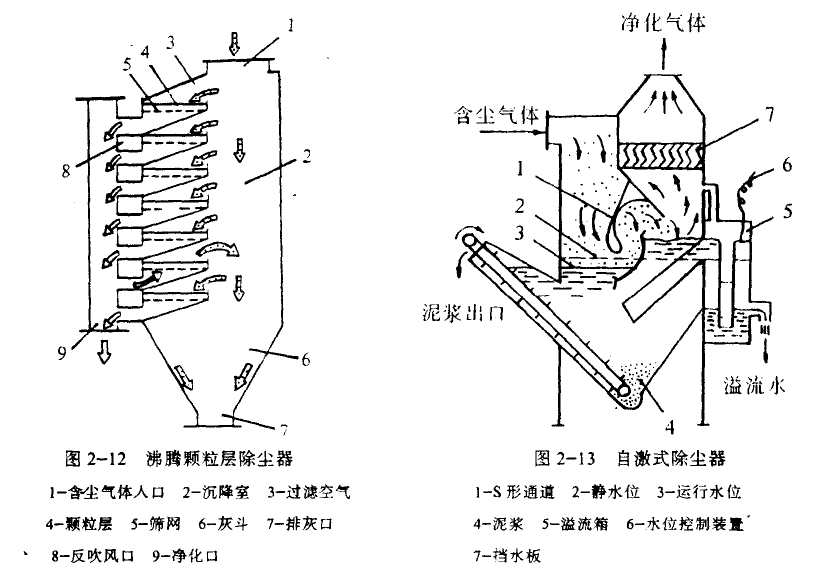 在積水式洗滌除塵器中,除塵室內有一定量的水或其它液體,含塵氣體以很高的速度通過時形成液滴和液膜,從而對含塵氣體進行洗滌.這種除塵器的優點在于水可以循環使用,所以只要少量的補充水就可以進行洗滌式除塵.通常分離50%的臨界拉徑是15m左右,壓損范圍為0.5-4kPa,耗水最一般低于0.13L/ m3.鑄造車間常用的這種除塵器是自激式除塵器(圖2-13)